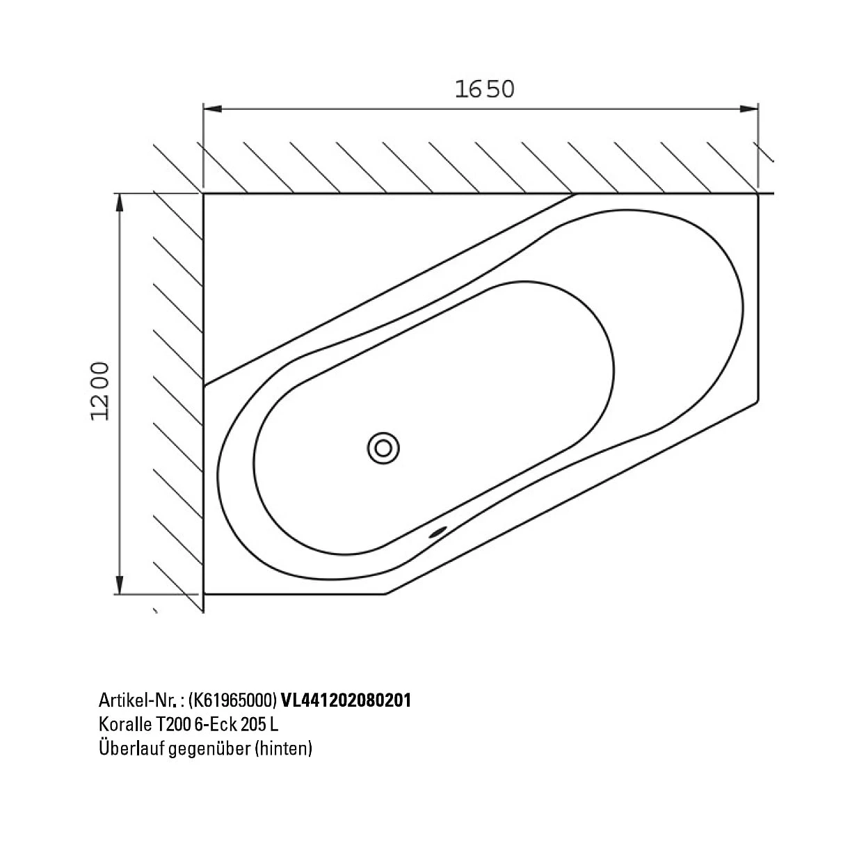 Koralle T200 6-Eckbadewanne 205 L, Überlauf hinten