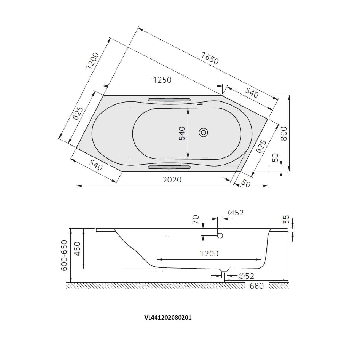Kaldewei Vaio 6 Star Sechseckbadewanne 959 Mit Griffbohrung, Überlaufloch Gegenüberliegend