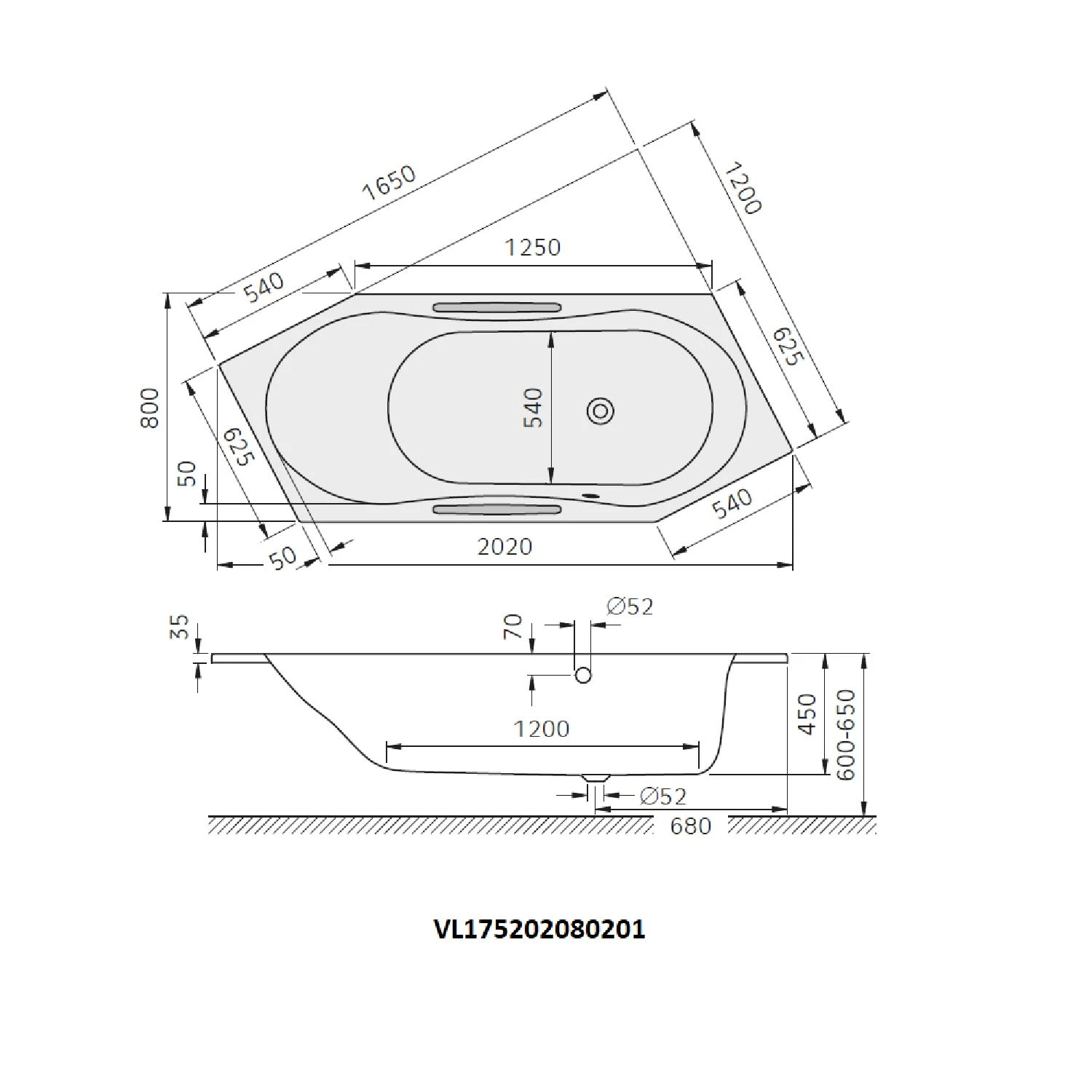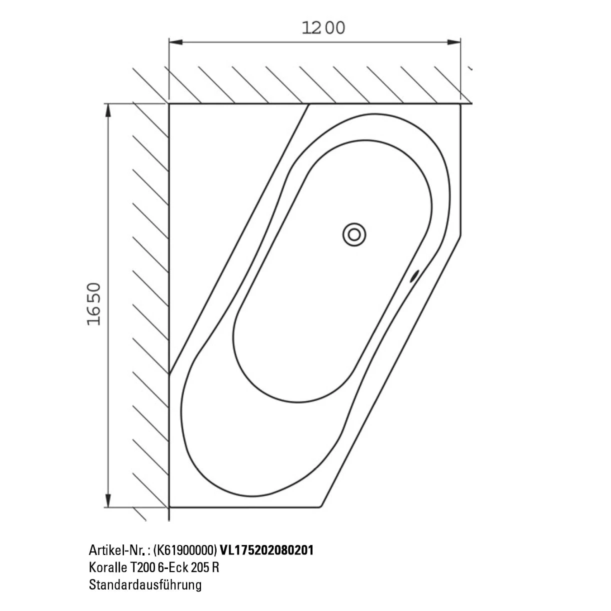 Koralle T200 6-Eckbadewanne 205 R, Überlauf vorne