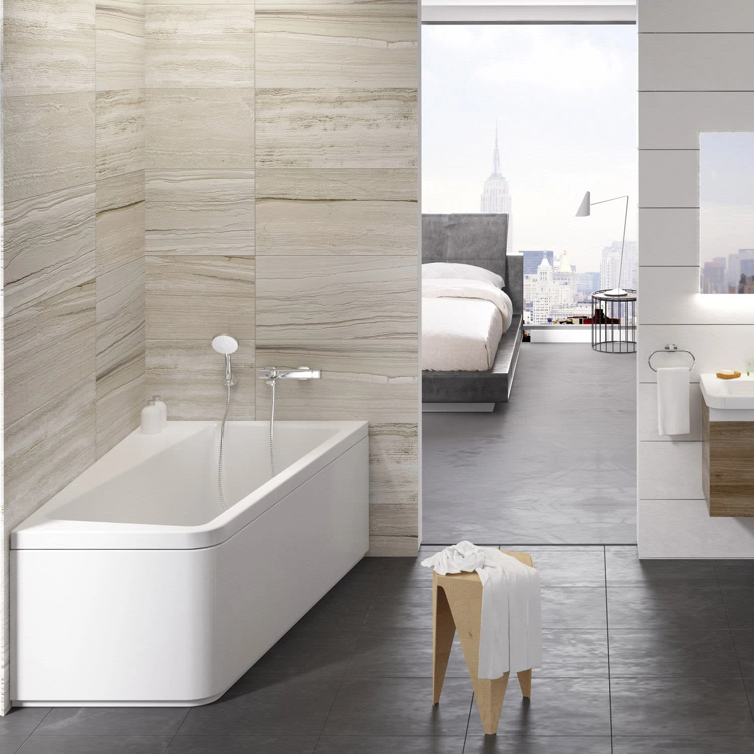 Um mehr nutzbare Fläche, etwa für Ablageflächen oder einen Duschsitz zu erhalten, reicht es, die klassische Badewannenform um gerade mal 10° zu drehen.