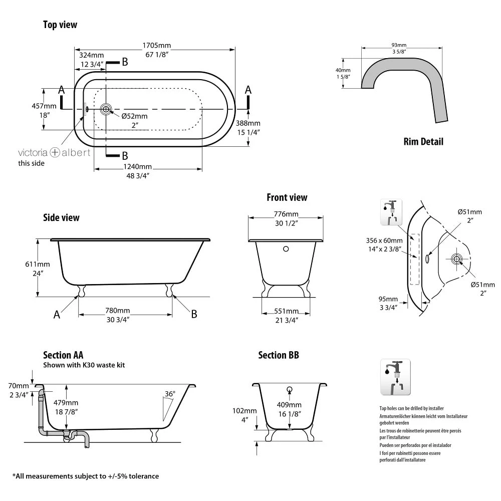 Ohne Löcher für Wannenrandarmaturen. Geeignet für freistehende oder an der Wand montierte Wanneneinläufe; Montage von Armaturen auf dem Wannenrand möglich, für die aber vor Ort Löcher gebohrt werden müssen.