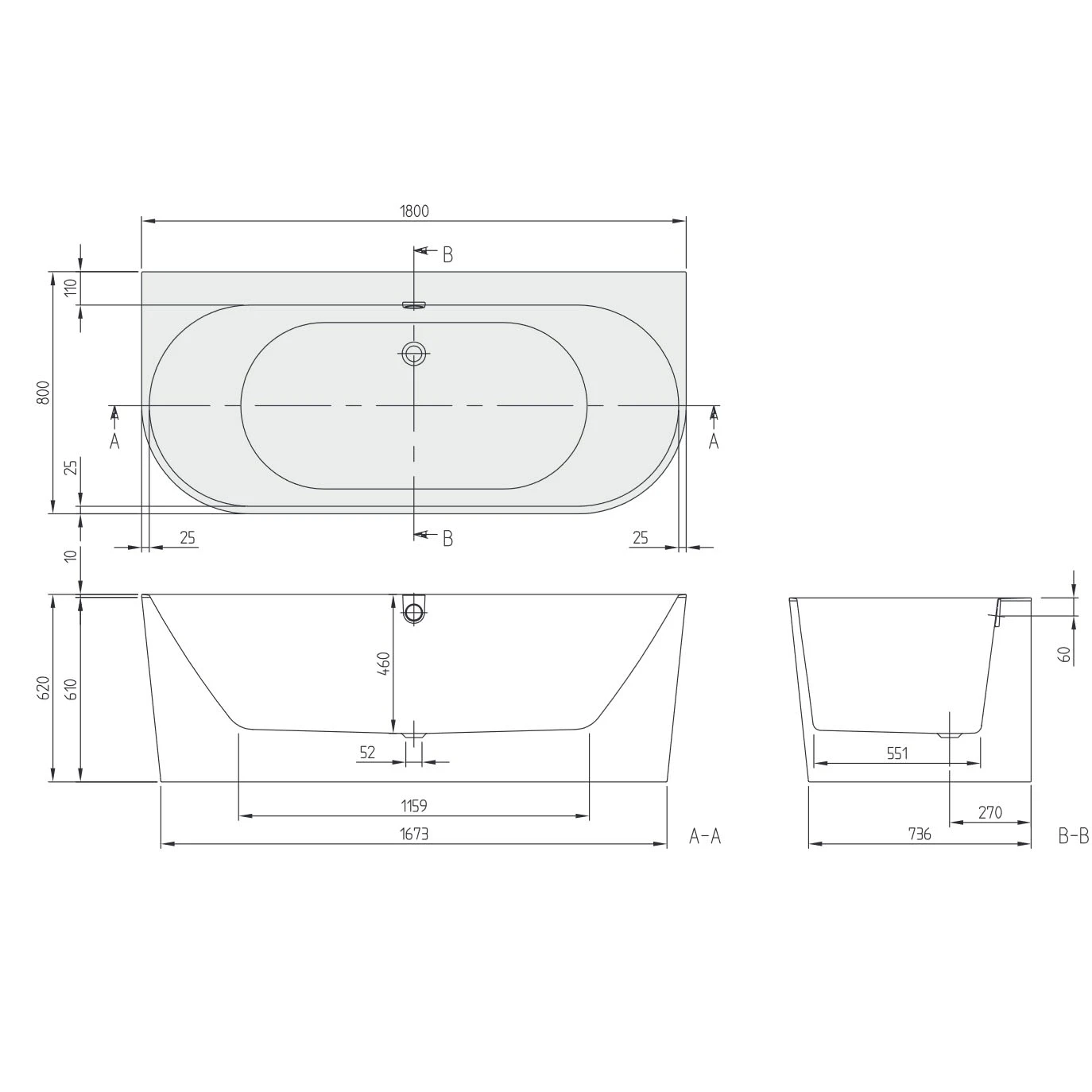 Villeroy & Boch Oberon 2.0 Vorwandbadewanne 180 x 80 cm inklusive Airpool Comfort mit Technik Position 1